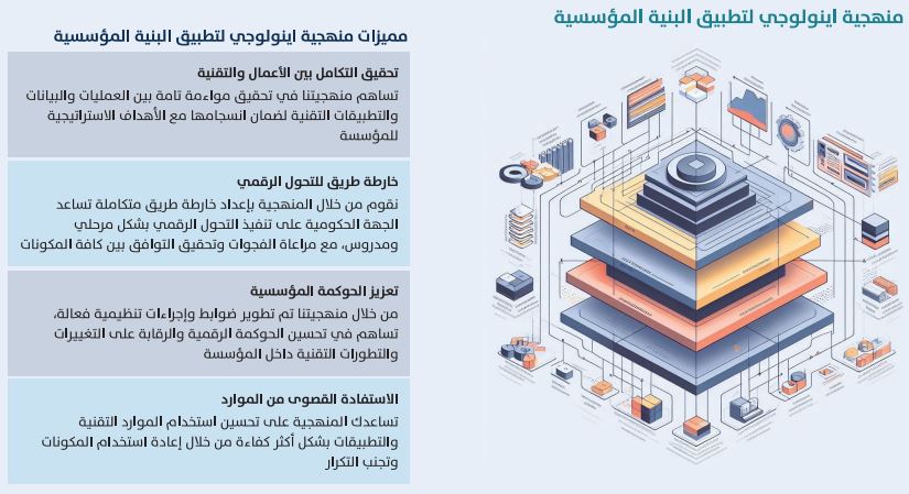 خدمة تأسيس البنية المؤسسية في الجهات الحكومية من خلال تطوير ممارسات وضوابط لدراسة الوضع الحالي للجهة الحكومية، وبناء خارطة الطريق للتحول إلى الوضع المستقبلي لتحقيق المواءمة بين قطاع الأعمال (الخدمات والإجراءات) وتقنية المعلومات (البيانات، والتطبيقات، والبنية التحتية) والأهداف الاستراتيجية للجهة الحكومية.